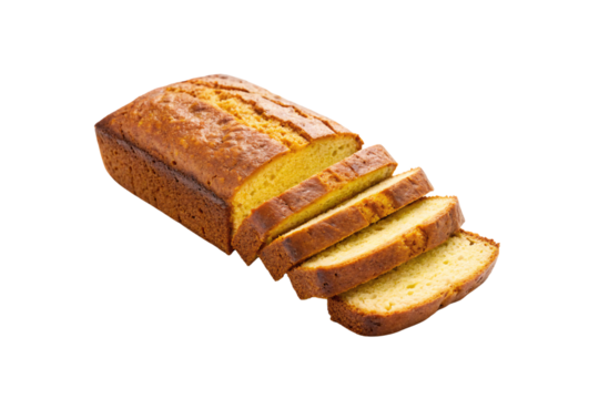 Homemade pound cake loaf sliced to show dense yellow interior crumb, isolated on a transparent background