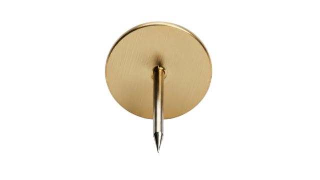 Brass push pin isolated PNG on transparent background, golden thumbtack for office supplies and bulletin boards, notice board
