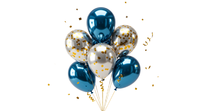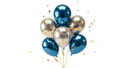 Blue and gold confetti balloons bouquet with golden ribbons isolated on white background perfect for celebrations and party decorations