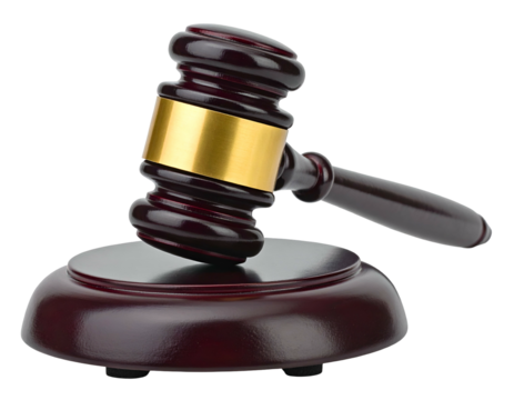 A wooden judge gavel and sound block stand on a transparent and white background with golden detail, concept for legal proceedings, law enforcement and court rulings