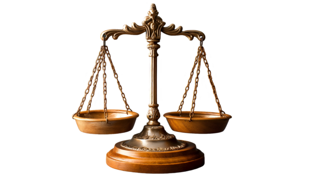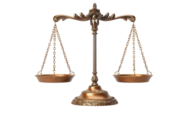 Brass Scales of Justice Antique Legal Icon, Golden Balance for Court and Order, isolated on transparent background.
