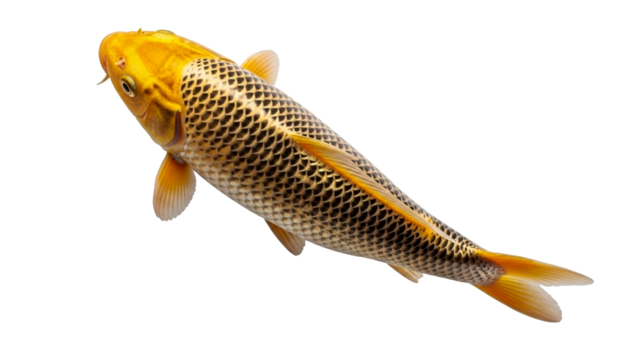 A vibrant golden yellow fish with intricate scales and fins swimming gracefully isolated on a transparent background