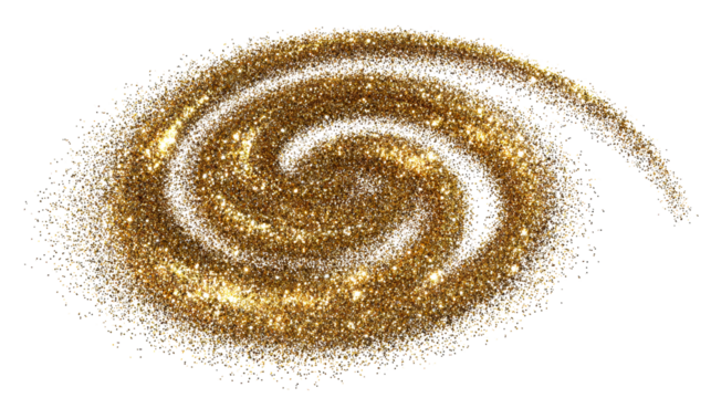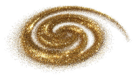 Swirling golden glitter particles forming a spiral shape on a transparent background
