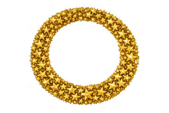 Elegant golden star confetti forming a circular frame on a white backdrop, perfect for invitations, greetings, and celebratory designs. Create a