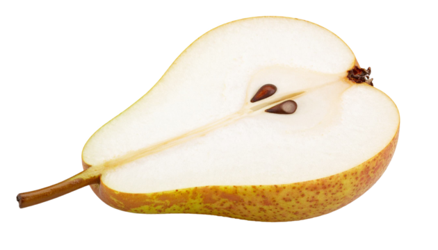 Halved ripe pear displaying golden flesh, dark seeds, and woody stem on clean transparent surface