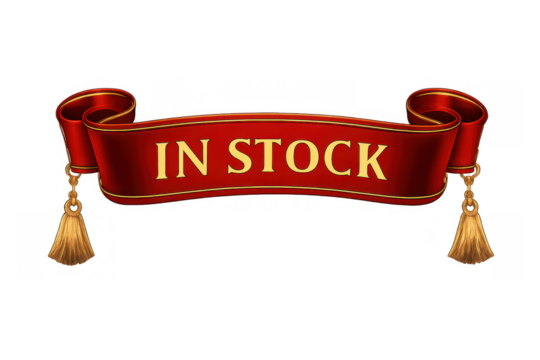 Red ribbon banner with golden tassels and in stock text, signifying product availability for retail and e-commerce marketing
