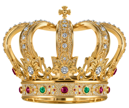 Golden jeweled crown, isolated, black background, royalty, luxury design