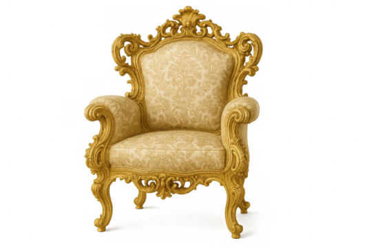 The golden throne a yellow chair adorning a white background cut out on PNG. AI GENERATED.