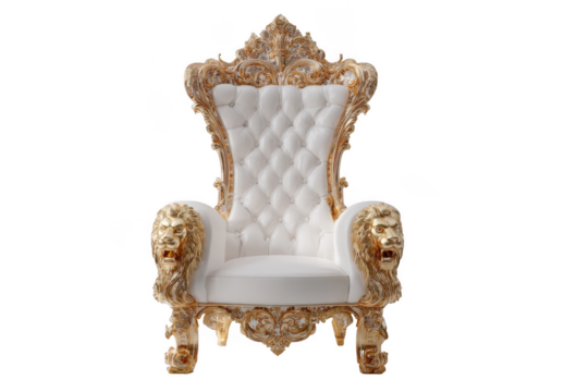 Elegant antique white tufted throne armchair with ornate gold carved wooden frame isolated on transparent background