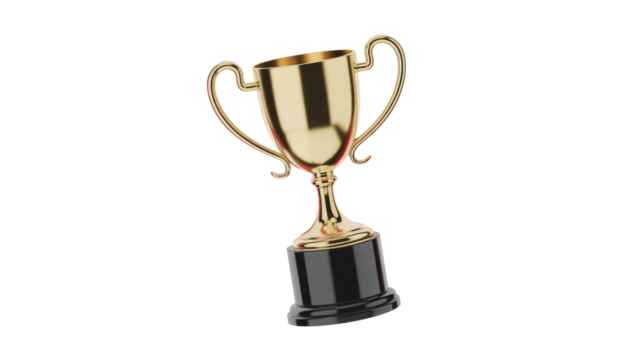 A gleaming golden 3D trophy with elegant handles and a black base, representing success and achievement, isolated on a solid transparent background. background removed