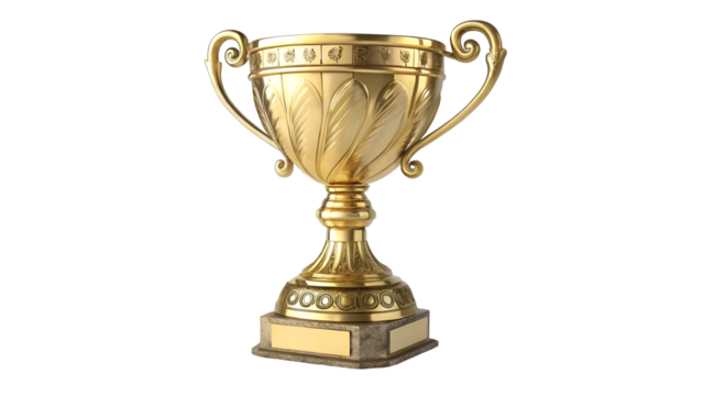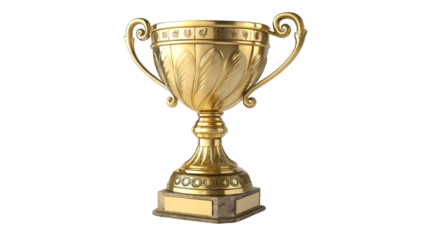Ornate golden trophy with intricate engravings isolated on transparent background. Winner golden trophy cup isolated on white background.