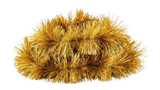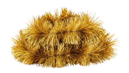Golden tinsel garland lies in a heap on a white background for decoration purposes clearly shown.