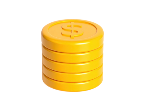 A stack of five golden coins with dollar symbols, isolated on a black background