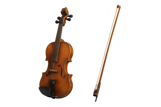 A golden-brown classical violin, a beautiful string instrument, gracefully rests diagonally against a solid transparent background, highlighting its elegant curves. background removed