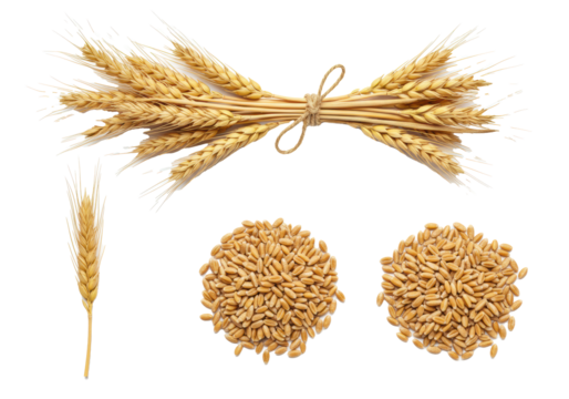 hyperrealistic macro flat lay still life of golden ripe wheat ears, grains, and a tied sheaf, detailed straw texture, against a seamless transparent studio background. concept of agricultural