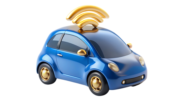A blue cartoon car with a golden wifi symbol on top isolated on transparent background, representing connected vehicle technology