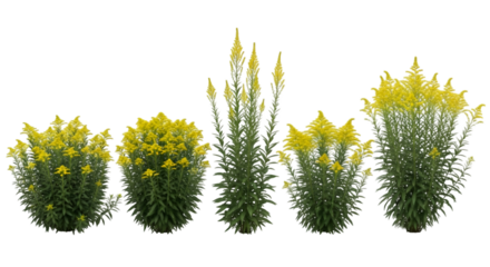 A vibrant clump of bright yellow goldenrod flowers with green stems and leaves isolated on transparent background