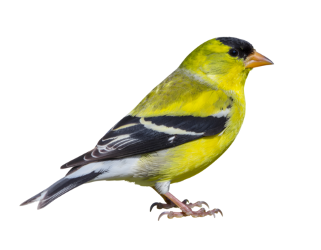American goldfinch, full body, vibrant yellow plumage contrasting with black wings and cap, isolated against a pure white background, detailed texture of feathers, natural pose, high key lighting