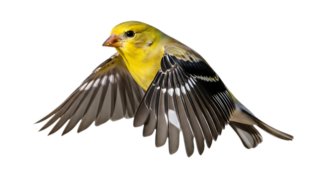 American Goldfinch, in mid-flight with wings spread wide, cutout, PNG isolated on white or transparent background