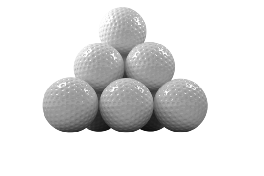 White golf balls stacked in a pyramid shape on a transparent background, PNG