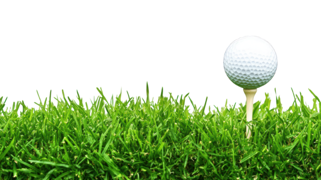 Close up of golf ball on tee, showcasing its textured surface and dimples. Isolated on transparent or white background.
