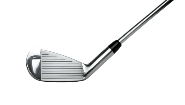 Angled close-up of a golf club hybrid, showing club face and shaft on black background