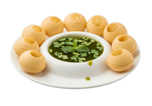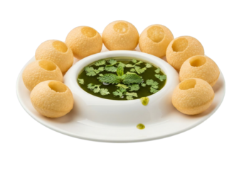 Delicious pani puri platter with chutney served on a white plate isolated on transparent background