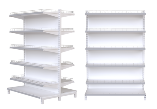 Store Shelves. Empty white retail display shelves supermarket gondola mockup. White supermarket shelving display or bookstore racks.