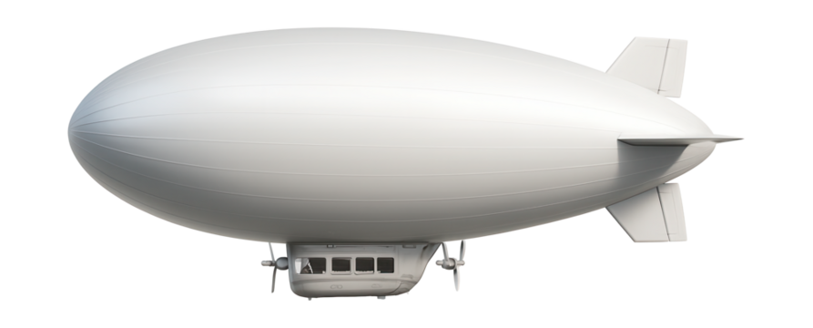 Sleek, white airship with gondola suspended below against a black background