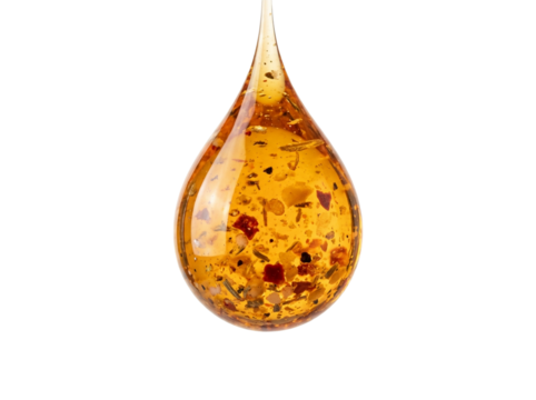 Close up of a golden liquid drop with inclusions. isolated on transparent background
