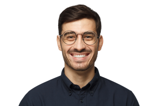 Cheerful young man in casual denim and blue shirt smiling transparent background