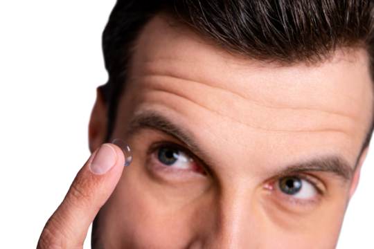 Close up cropped view photo of concentrated lovely pretty handsome millennial use have doctors office service want good eye vision hold hand finger look isolated grey background