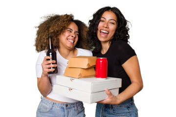 Two young women, one Latina and one with Afro hair, laugh as they hold pizzas and burgers from a recent delivery.
