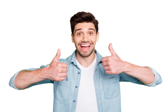 Photo of amazing business guy raising thumbs up approving good job quality results wear casual denim shirt isolated over green color background