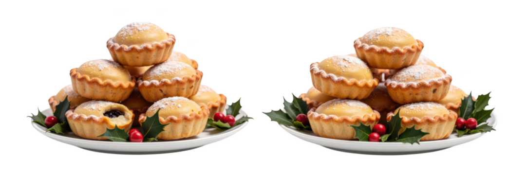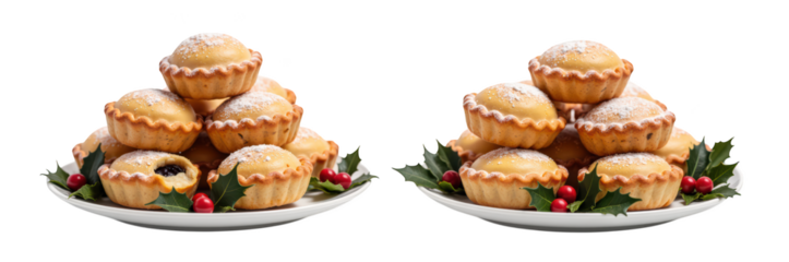 Festive baked goods arranged in decorative manner, featuring mini pies topped with powdered sugar and garnished with holly and berries