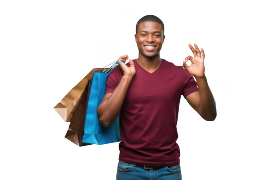 Man holding shopping bags and giving an okay sign isolated on transparent background