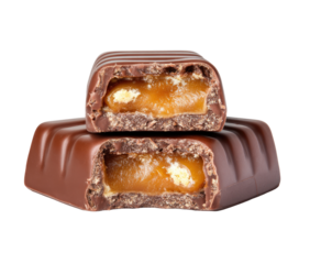Two pieces of milk chocolate caramel candy bar stacked, showing a gooey caramel filling
