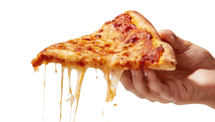 Close-up of a slice of cheesy pizza held in a hand, with gooey cheese dripping