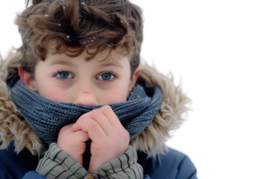 Young boy shrinking from the cold, wrapped in a cozy jacket