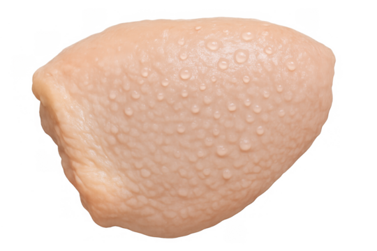 Fresh raw chicken fillet with skin and water droplets, visible texture on transparent background, preparing healthy meal