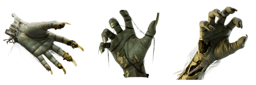 Set for Three Creepy Zombie Hands Reaching Out isolated on transparent background