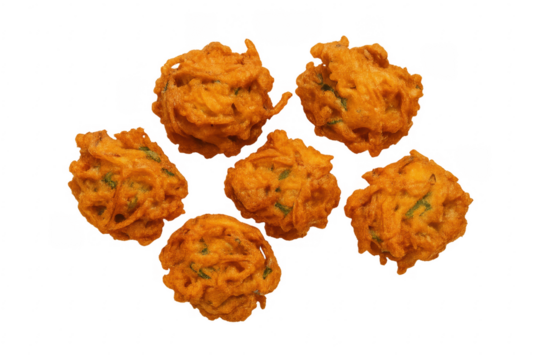 Six crispy onion bhajis floating on transparent background