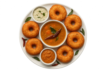 Medu Vada with Sambar and Chutneys, isolated on transparent background.