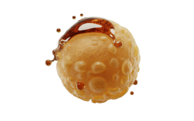Sweet bread fritter with a bite taken, soft dough dripping with rich caramel sauce on transparent background