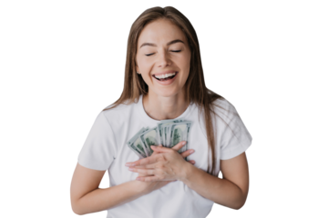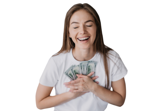 Excited blonde caucasian girl smiling eyes closed presses banknotes to chest, got salary against transparent background. Happy Swedish young woman received money, celebrates. Prize, lottery, winner.