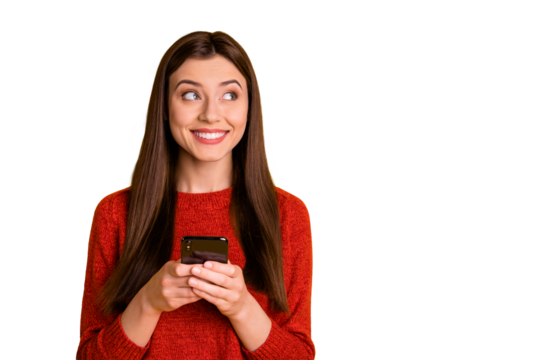 Photo of beautiful cute trendy charming pretty girl holding telephone pondering over like she just got staring into empty space isolated over vivid color background yellow