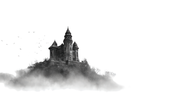Abandoned Castle in the Fog background isolated on a Transparent background, PNG file.