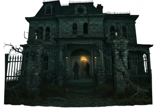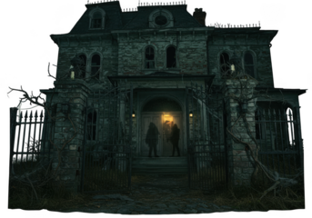 A spooky haunted house with silhouettes at the entrance isolated on transparent background