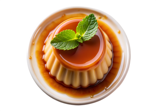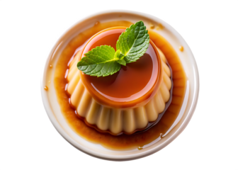 Creamy caramel pudding dessert top view isolated on white background for bakery and food design concepts.