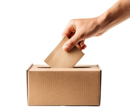 Red i voted button for election day participation, demonstrating civic duty and political engagement on transparent background